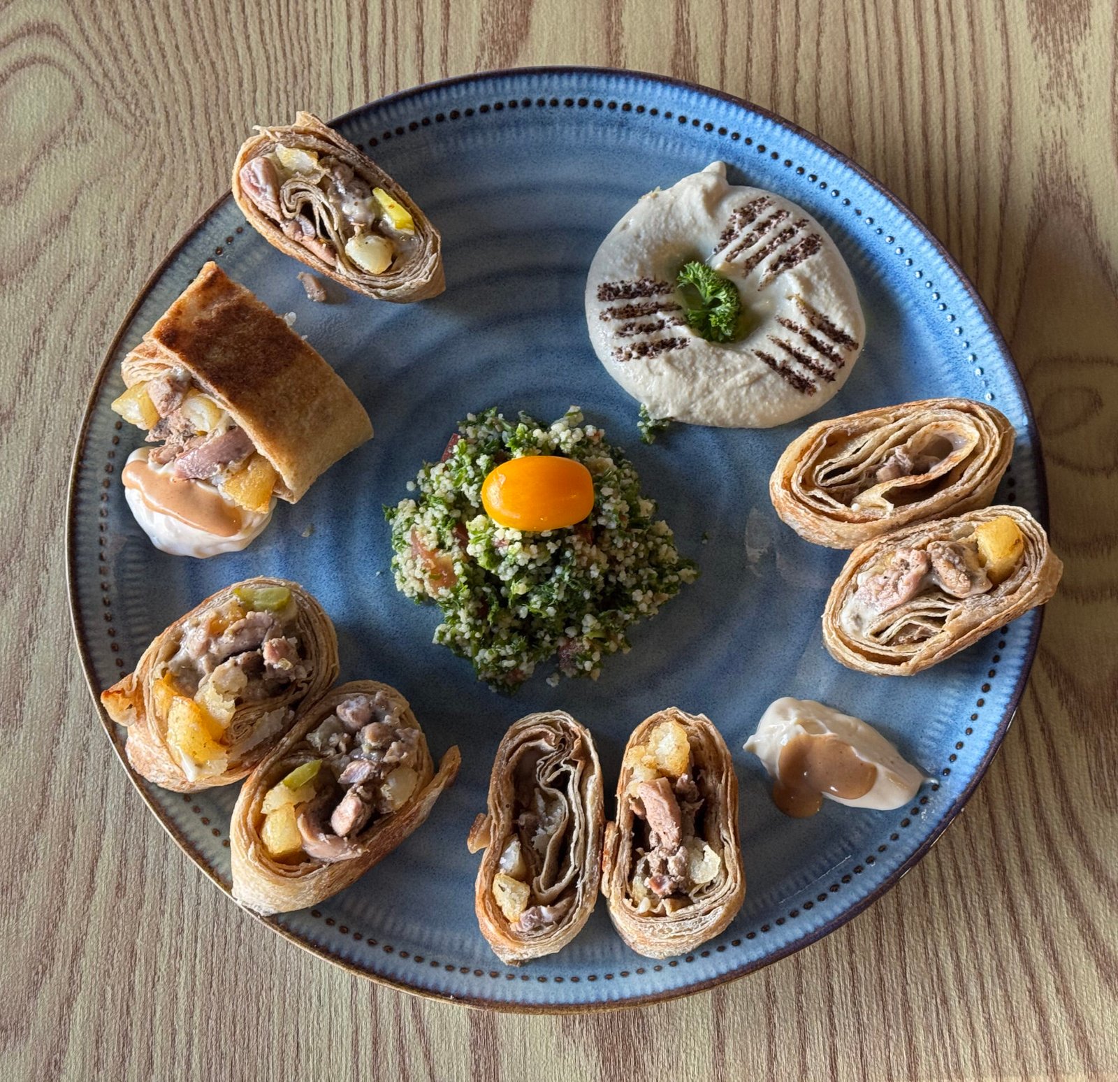 Crispy golden falafel with hummus, salad, and tahini dressing.