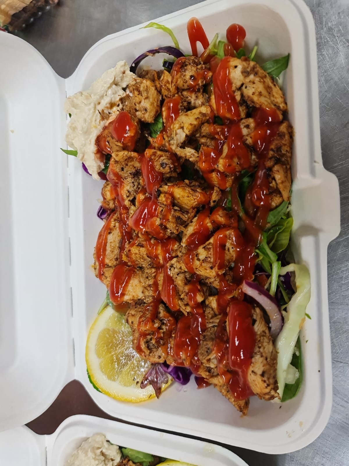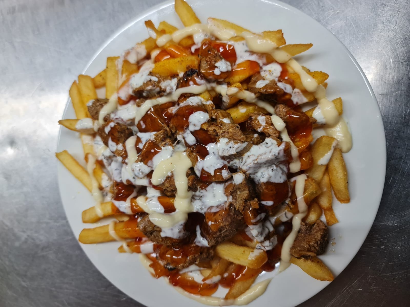 Spicy Cajun chicken on a bed of rice or fries, topped with garlic & chilli sauce.